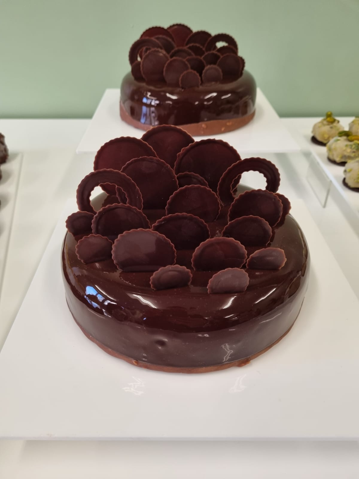 Torta alla doppia glassatura, semifreddo alla liquirizia, semifreddo al cioccolato fondente e lastre croccanti sempre di cioccolato fondente.