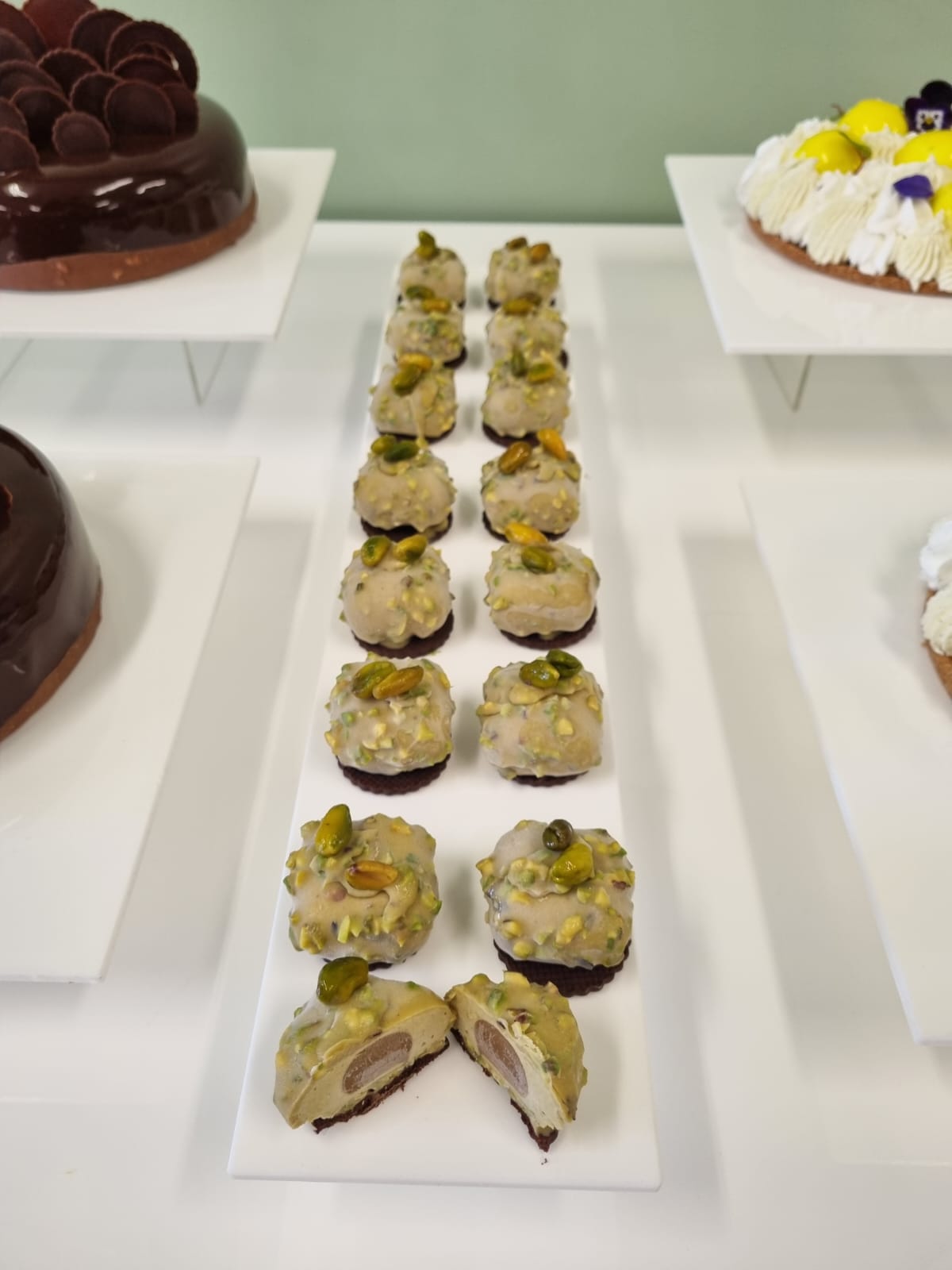 Mousse ghiacciata al pistacchio, cuore al pralinato e glassa anidra.