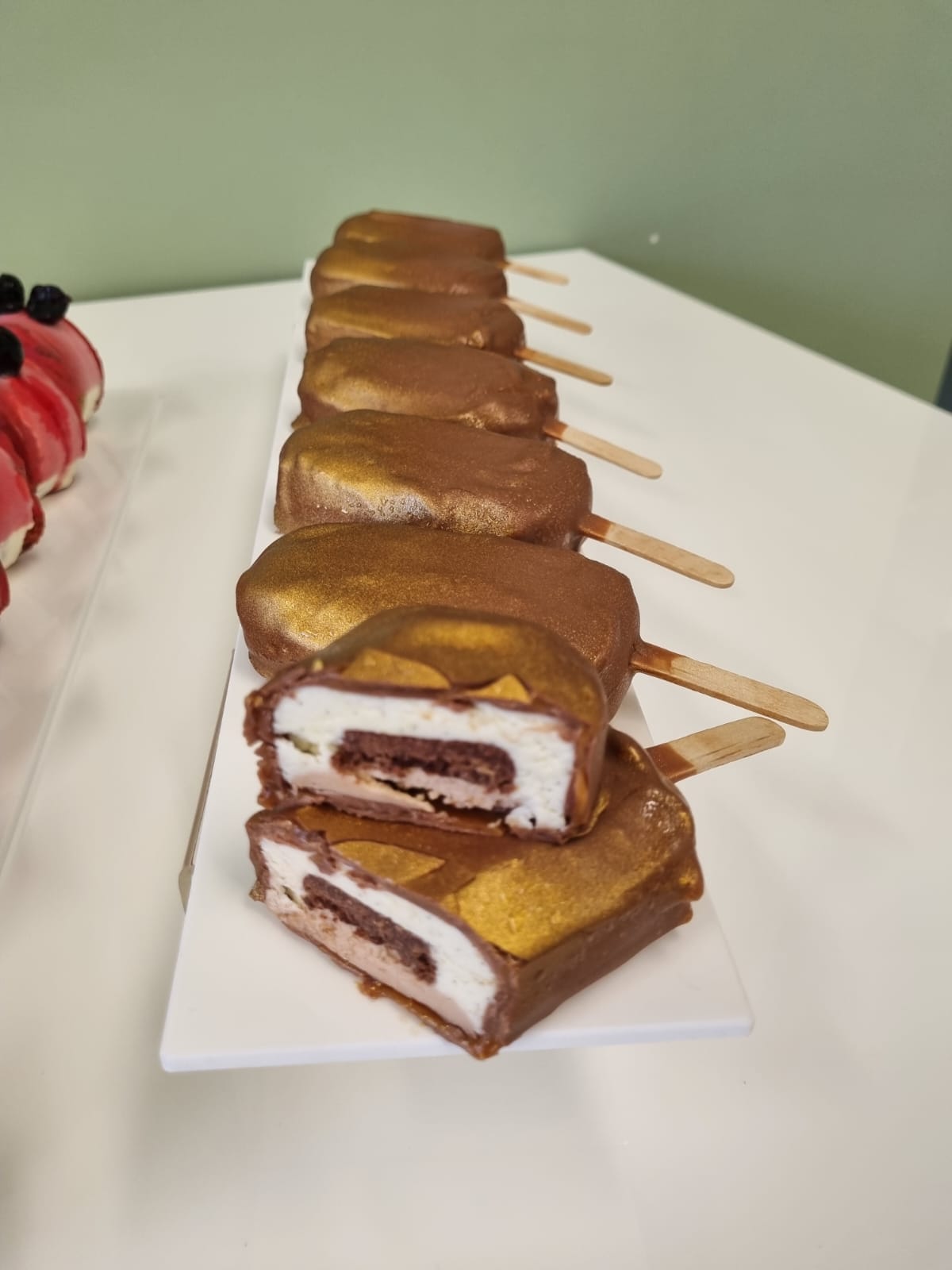 Gelato su stecco al semifreddo alla tripla vaniglia, croccantino crumble, glassa doppia al cioccolato al latte con caramello mou.