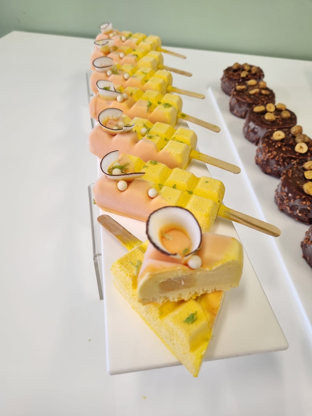 Stecco gelato, semifreddo esotico e gelatina al frutto della passione, lime e mango. Cocco croccante e cioccolato bianco.
