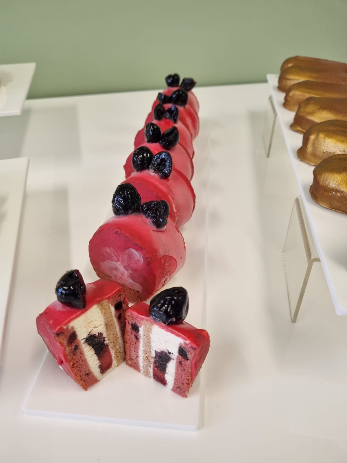 Biscuit alle amarene e fragola, croccantino al cioccolato bianco, gel alla fragola e amarena, semifreddo alla doppia vaniglia e amarene.